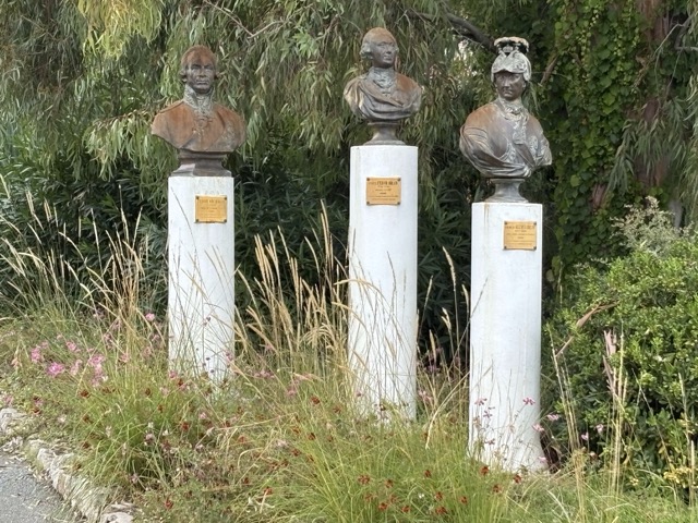 Centre & Right busts – In 1781, two brothers, Alexei and Grigory Orlov, were among the first notable Russian visitors to Villefranche-sur-Mer. In 1996, these two statues representing the Orlov brothers were donated by the Saint Petersburg Naval Academy. Left Bust – Fyodor Fydorovitch Ushakov (1744-1817) was the founder of the Russian fleet.